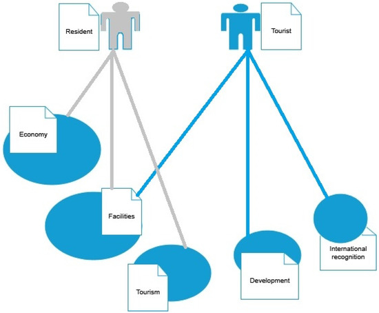 The second question was in relation to the positive effects. Rather surprising, residents and tourists were in agreement. They only differed by an unrepresentative percentage (3%). The codes categorized for the question about positive effects and advantages are visually illustrated by a concept map (Figure 3). The size of the circles represents a higher frequency in the results. The code ‘economic’ includes wealth, economy, money, profits, and benefits. With ‘facilities’, integrated perceptions are related to connectivity, travel, good communications, and good infrastructures.