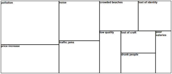 In relation to negative effects, no significant differences were found when comparing the perception of residents and tourists. After a word frequency query (Figure 4) was carried out, the findings showed similar ways of perceiving negative effects. ‘Noise’, ‘pollution’, ‘traffic jams’, and ‘price increase’ were the most mentioned between the two groups.