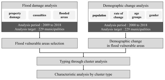 The purpose of this study is to provide the basis and implications for the establishment of urban disaster preventive policies in response to climate change. To this end, we considered two aspects that were not considered in previous studies. First, in relation to the establishment of a flood disaster prevention policy considering regional characteristics, we conducted regional flood disaster vulnerability assessments of the 229 municipalities in South Korea. In this study, the term “regional flood disaster vulnerability” represents the degree to which flood disaster will occur again based on past flood damage. Second, we categorized the flood vulnerable areas in South Korea by considering the demographic change indicators. In this study, the “Demographic change” implies any change in the population, for example, a change in population size, the rate of population change, and the population proportion change by age groups and gender. The research flow chart applying the two aspects considered is explained below (Figure 1).