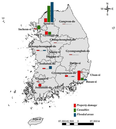 In addition, more than half of the property damages, casualties, and flooded areas were observed in two to three administrative regions. A large variation in flood damage was obtained in different regions. These results indicate that flood disaster prevention plans need to be established such that the most damaged regions are prioritized in terms of the implementation of plans. Further, the most damaged areas need to be analyzed with more precise units such as si/gun/gu.