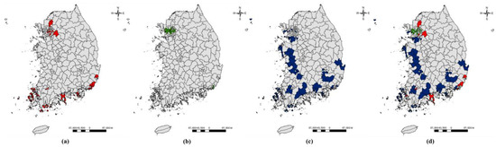 Gangseo-gu in Seoul-si had the largest damaged area, accounting for 77.59% of the total damaged area. The flooded areas of the 30 most damaged municipalities accounted for 99.94% of the total damage. This result indicates that all the regions with flooded areas were ranked in the top 30. With the analysis of the overlap between the 30 most damaged regions in the three categories of property, casualty, and flood area, two si/gun/gu (i.e., Seocho-gu in Seoul-si and Yeonje-gu in Busan-si) overlapped across all three categories of damage, whereas 12 si/gun/gu (i.e., Seodaemun-gu, Yangcheon-gu, Gangseo-gu, Dongja-gu, Gwanak-gu and Songpa-gu in Seoul-si; Yeongdo-gu, Dongrae-gu, Nam-gu and Haeundae-gu in Busan-si; Bupyeong-gu in Incheon-si; and Gwangmyeong-si in Gyeonggi-do) overlapped across two categories. Considering these, 74 si/gun/gu were selected as the final flood vulnerable areas.
