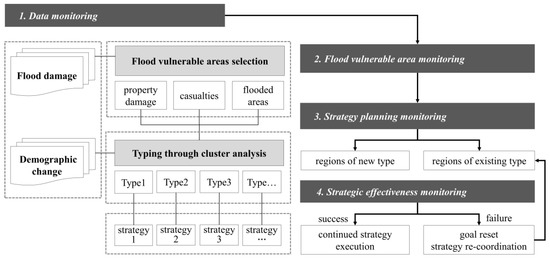 Flood disaster risk reduction management is a continuous process that involves identifying issues, defining objectives, assessing risks, appraising strategies, implementation, monitoring, and review [43]. Flood damage and demographic characteristics are constantly changing, and there is a need to monitor the changing trends and re-evaluate flood vulnerable areas. Further, the effectiveness of the proposed strategy for each region needs to be monitored based on type, and the goals and strategies need to be adjusted according to the monitoring results. Within this monitoring system, evaluating flood vulnerable areas is considered a cyclical process involving the design and evaluation of alternative strategies. The proposed monitoring system is illustrated in Figure 5 and explained below: