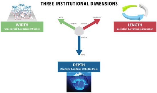 The three dimensions can be used to describe how deeply, widely, and persistently institutionalized dominant institutions are, as well as the institutional changes or creation of alternative institutions that social innovators seek to achieve. The transformation of society into a market society [19] is an example of a deep change, which continues to be influential at the global level in a way that is coherently adaptive to diverse cultural contexts. While transformative change is oftentimes glorified as the most important or desirable type of change (especially among those seeking to bring it about), this is not necessarily the case for everyone or every situation. It is one type of change among many others that may be more appropriate in certain situations or contexts, while other types of change (e.g., incremental change) are equally or more appropriate in other situations [20]. The 3D framework helps to be more explicit and intentional about the kind of change sought, i.e., the degree of depth, width, and length at which actors seek to intervene. The three institutional dimensions are briefly summarized in Table 1, based on our original framework [16]. See Figure 1 for a graphic representation, emphasizing the degrees of institutionalization for each dimension.