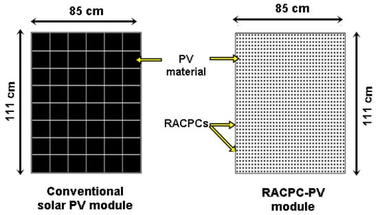 - RACPC-PV module with dimensions of 111 cm × 85 cm requires 1850 solar cells, each being 1 cm2. Moreover, as mentioned in Abu-Bakar [], it was possible to arrange custom-made solar cells to required dimensions, with prices for each cell being proportional to the PV material used. As a result, there is a 24.7% reduction in PV material. The calculated cost of PV material to produce an RACPC-PV module adds up to GBP 6.64 per module.