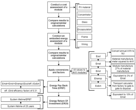 During the examination of modules, it is important to maintain the fairness of the assessment, thus making the assessment non-bias. As a result, the cost and embodied energy of modules will be assessed to a module size of 0.94 m2. Moreover, the resulting parameters will be transformed into a 4-kW system to simulate the most common solar installation for household and small business owners [].