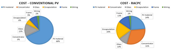 The total price for a module of a conventional solar panel totals at GBP 39.66, unlike the RACPC-PV module, which is 29.09% cheaper, costing GBP 28.12. An investigation of Figure 4 pointed out the PV material for having the greatest contribution on module cost, with around 75% difference between the PV material cost of conventional PV and RACPC-PV module.