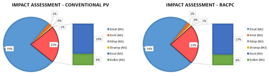 Another important factor to consider is the energy required for the installation of modules, Einst. Consequently, accounting for 3% of the energy required for the manufacture of the materials and the assembly of the module, resulting in a total of 5.00 and 4.28 GJ for the installation of a conventional PV and RACPC-PV module.