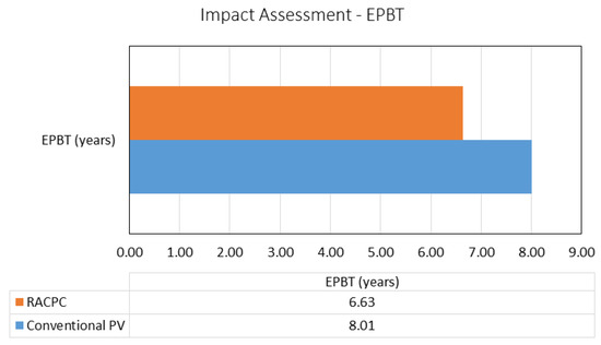 From the assessment, the calculated EPBT for a conventional PV and RACPC-PV was 8.01 and 6.63 years, which converts to 8 years, 4 days and 6 years, 230 days, respectively. With a difference of 1 year and 135 days, RACPC-PV is accepted to be a more profitable and economical module for a 4-kW installation. The results are presented in Figure 7.