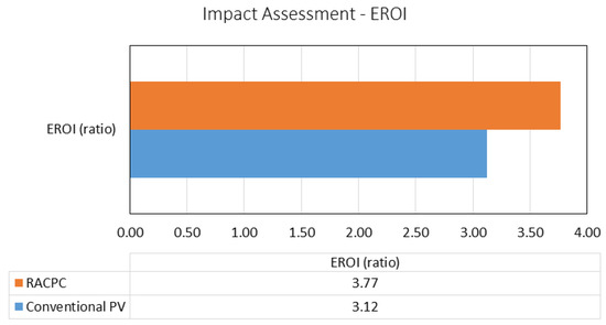 For the EROI, the conventional PV and the RACPC-PV have both been assessed, with the resulting ratios of 3.12 and 3.77, respectively (see Figure 8). As a result, both modules are considered as a source of energy, generating more energy than it takes to produce, transport, install and maintain. Furthermore, the RACPC-PV module has a greater EROI ratio. Meaning that, throughout the modules lifespan of 25 years, the system utilizes less energy, resulting in a quicker return on investment. Consequently, RACPC-PV is considered a more environmentally friendly module.