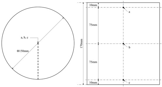 Schematic diagram of sensor locations (left: plane view; right: front view; sites a, b, c are the location of thermal sensors).