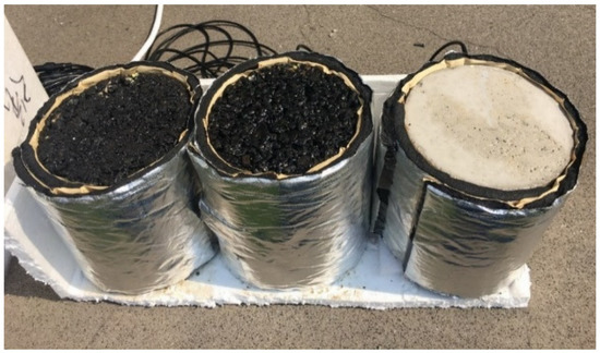The sides and bottom of all the three specimens were wrapped with thermal insulation to avoid heat transfer from these locations. Figure 2 depicts the wrapped and instrumented specimens. The wrapped and instrumented specimens were placed in an open field with natural sunlight and kept a certain distance from each other. Firstly, the specimens were placed in the open field for a week to reach a balance in the environment. Then the temperature monitoring started.