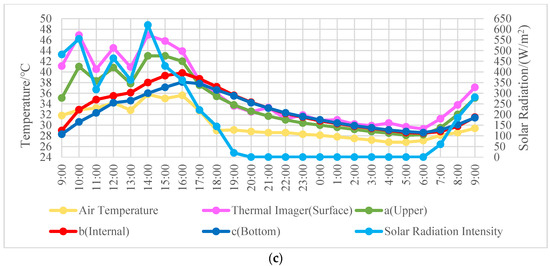 The original recorded data of the temperature and solar radiation intensity as shown in Table S1. Figure 3a–c illustrates the air temperature change, the solar radiation intensity change, and the temperature change of the surface, the upper part, the middle part and the bottom part of the specimens in a typical cycle. As can been seen, the temperature of the surface and the upper part was higher than the air temperature throughout the test cycle for all the three materials. The temperature of the middle and the bottom parts was lower than that of the air in the morning. During daytime, the surface temperature was the highest and the temperature decreased gradually with the increase of depth. The air temperature started to decrease when the solar radiation intensity became weak and reached a low level quickly, while the temperature of the materials decreased at a relatively low rate. At night, the temperature of the upper part was slightly lower than that of the middle and the bottom for all the three materials. However, the surface temperature had more fluctuations.