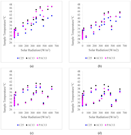 Figure 4a–d depicts the relationship between the pavement materials temperature and the air temperature at the same time. Figure 5a–d depicts the relationship between the pavement materials temperature and the solar radiation intensity at the same time.