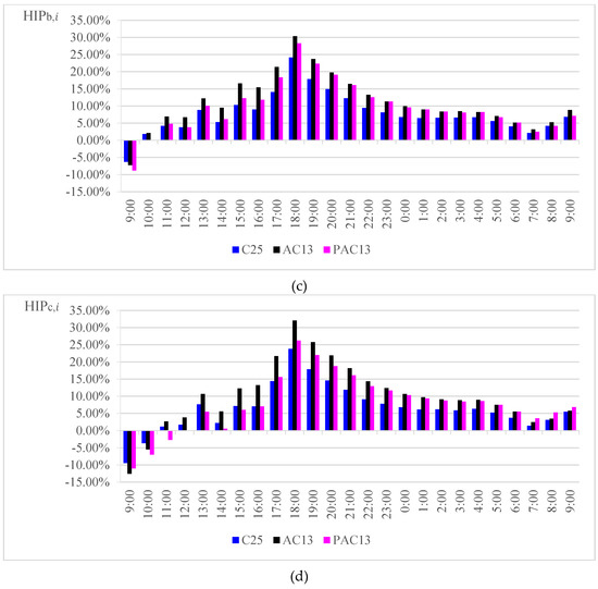 According to Table 8, which compares the heat absorbed and released by three materials in one cycle, the order of heat absorption capacity was AC13 > C25 > PAC13 and the order of heat release capacity was also AC13 > C25 > PAC13. The results have shown that dense asphalt concrete pavements have more effect on the UHIE than cement concrete. Porous asphalt pavements have less effect than dense asphalt concrete. The results of thermodynamic analysis are consistent with the index HIP.