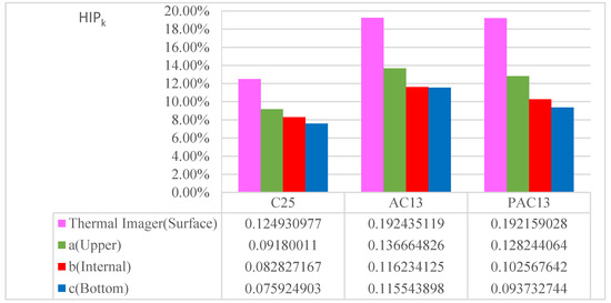 Figure 7 depicts the accumulated heat island potential of the three pavement materials at different locations. It is shown that the trend of HIP with the depth of pavement is the same for all the three pavement materials. The HIP decreases with increasing depth. The highest HIP emerges at the surface and the smallest HIP occurs at the bottom.