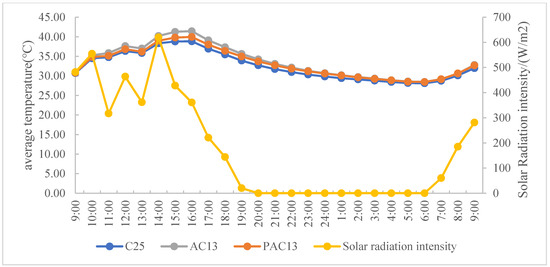 The data of the average temperature and solar radiation are shown in Table S2. Figure 8 presents the time variation of the average temperature and solar radiation. It can be seen from Figure 8 that the variation of the average temperatures of the three specimens has the same trend, which depends the solar radiation intensity and the temperature status of the specimens. Whether the material absorbed or released heat energy not only depended on the solar radiation intensity but also related to the temperature status of the material. The higher the temperature of the material is, the faster the heat was released. The stronger the solar radiation, the faster the heat absorption. The overall heat absorption or heat release is determined by both. The temperature of cement concrete was lower than those of the asphalt concrete mixtures. The temperature of porous asphalt concrete was lower than that of the dense asphalt concrete. In terms of temperature, the asphalt concrete may have more effect on the UHIE, and the effect is smaller with increasing porosity.