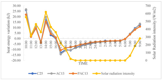The data of heat energy change per hour are shown in Table S2. From Figure 9, it is clear that the trends of heat absorption and heat release of the three materials are consistent and closely related to the solar radiation intensity. The heat absorption and heat release rate of dense asphalt concrete was the fastest among the three materials. It is also clear that by increasing the porosity of asphalt mixture, the rate can be effectively reduced.