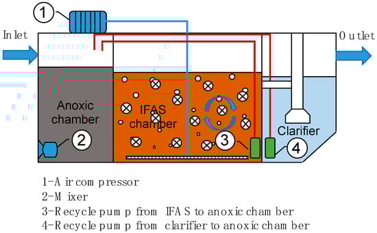 One of the greatest challenges for developing countries is wastewater treatment. Rapid urbanization led to a more concentrated release of wastewaters into the environment, which has significantly impacted humans and wildlife. Organic compounds and nutrients from municipal or industrial wastewater contaminate ecosystems, e.g., rivers, ponds, or even groundwater []. Low-cost wastewater treatment utilizing local materials can contribute to addressing this challenge, especially in developing countries. Wastewater stabilization ponds or constructed wetlands are known as appropriate low-cost wastewater treatment technologies, but they have large land area requirements, and the treatment efficiency is rather difficult to control. In developing countries, the conventional activated sludge process (CAS) has been the standard treatment method. During the last decades, new fixed-film processes, such as moving bed biofilm reactors (MBBR) and integrated fixed-film activated sludge (IFAS) systems, have also been widely applied [,]. These processes have performed well in terms of organics and nitrogen removal in both municipal [,] and industrial wastewater treatment applications []. The key differences between MBBR and IFAS are the possible longer hydraulic retention time and recycle of sludge in the IFAS system [].