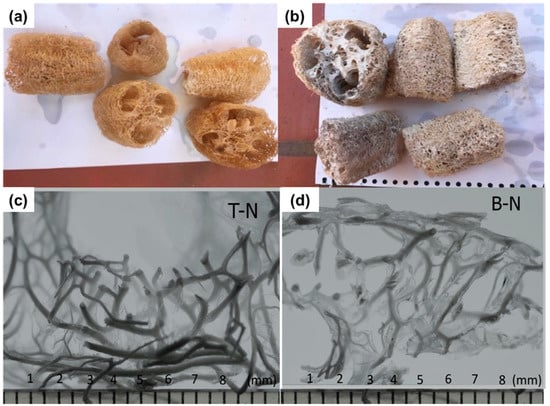 (a,b) Real images and (c,d) microscope images (×10 magnification) of the pristine and modified loofah sponges, respectively.
