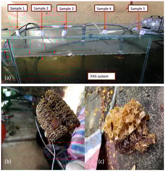 Loofah is an annual herbaceous plant from the cucurbitaceous family, and its fully developed fruit is the source of the loofah scrubbing sponges normally used in bathrooms and kitchens. They are also used for other applications such as for reinforcing composite materials []. Loofah sponges are lightweight, highly porous and have a large surface area, which makes them suitable as a bio-carrier material in IFAS and MBBR systems. So far, the most common research interest for loofah sponges is their adsorption capability, e.g., adsorption of phenol [], heavy metal [], and organic compound []. Loofah sponges are composed of hemicellulose (22%), α-cellulose (60%), lignin (10.6%), and others (7.4%) []. These components are biodegradable in water [,]. In order to enhance the durability of loofah sponges in aqueous solutions, some studies have modified them. Hideno et al. [] modified the loofah sponges by immersing them in an acetic anhydride solution to create acetylated sponges for the immobilization of cellulase-producing microorganisms. On the other hand, they soaked the luffa sponges in a Ca(OH)2 solution to increase the durability of the sponges to up to 10 days in a lab-scale bioreactor []. It should be noted that the modification with the alkaline solution was reported to reduce the leaching of hemicelluloses, waxes, impurities, and lignin from the fibers [].
