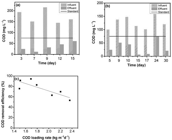The COD removal of the IFAS system using the pristine loofah sponges as bio-carriers is presented in Figure 4a. The COD of the influent wastewater was 175.2±32.5 mg L−1 (Figure 4a), so this was a relatively low organic strength municipal wastewater. The COD of the effluent was 35.2 ± 18.9 mg L−1, which is lower than Vietnam’s COD standard for treated wastewater of 75 mg L−1 [] (Figure 4a). The IFAS/pristine loofah carriers’ system initially achieved a high average COD removal (79% ± 13%). However, the COD removal decreased to 62% after 15 days. It is speculated that this was caused by the structural degradation of the loofah sponges, which decreased the mass of attached microorganisms that were retained within the bioreactor.