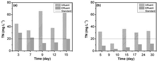 The nitrogen removal performance of the IFAS/pristine and modified loofah sponge pilots are shown in Figure 5. For both runs, there was a significant fluctuation in the influent TN concentration. During the IFAS run with the pristine sponges, the influent TN concentrations were higher than during the IFAS- modified bio-carrier run (45.7 ± 1.9 mg L−1 versus 29.7 ± 9.3 mg L−1). As observed, after 9 days the IFAS/pristine loofah sponge system achieved a relatively high TN removal (i.e., 80.3%) (see Figure 5a), however, the nitrogen removal gradually decreased after 15 days (i.e., 47.4%). This is likely due to the degradation of the loofah fibers after 15 days, as discussed above. The influent and effluent TN concentrations for the IFAS/modified loofah sponge bio-carriers are presented in Figure 5b. In all the testing, the IFAS/modified loofah bio-carrier system’s effluent met Vietnam’s 20 mg TN L−1 standard []. It should be noted that the TN removals also decreased on the 24th day of the run, however, the addition of new bio-carriers did not result in recovery as for the COD removals. This may be due to the fact that nitrifying bacteria grow more slowly than heterotrophs, and thus require more time to recover. The average percent TN removal using the modified carriers were superior to those observed for the pristine loofah bio-carriers, 71 ± 8% versus 53 ± 22%. This may have been influenced by the lower feed TN concentrations during the IFAS/modified loofah bio-carrier run.