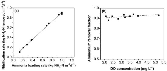 Nitrification analysis: (a) nitrification rate and ammonium loading rate and (b) DO and ammonium removal rate.