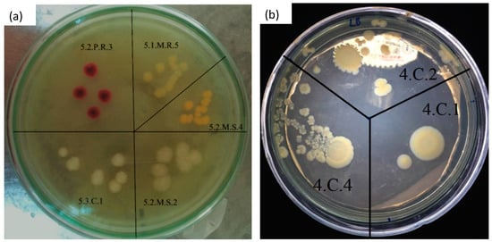 Understanding the dominant microorganisms in suspension and the bio-carriers would help optimize conditions for their growth and maximize pollutant removal. The microorganism strains developed in the tank system and on modified loofah sponges were collected on days “12” and “24” for the microbial analysis to determine the dominant microorganisms. Results from dendrograms were calculated with the un-weighted pair group method and combined with arithmetic mean algorithm (UPGMA) clustering (Pearson correlation coefficient) of 16S-rRNA patterns. They identified six main groups of microorganism strains: (1) Common strain: round colonies, thick, diameter between 1–2 mm, white, most abundant (below Figure 7a, labeled 5.3C1), (2) Branched strain: round colonies, branched at the edge, diameter between 3–4 mm, white (labeled 5.2MS2) (Figure 7a), (3) Red strain: round colonies, thick, red, more intense color in the center, diameter between 2–3 mm (labeled 5.2PR3) (Figure 7a), (4) Orange strain: round colonies, orange, diameter between 1–2 mm (labeled 5.2MS4), (5) Yellow strain: round colonies, yellow, diameter between 1–2 mm (labeled 5.1MR5) (Figure 7a) and (6) White strain: curve-round colonies, smooth surface, diameter 4–15mm (4C1, 4C2, 4C4) (Figure 7b).