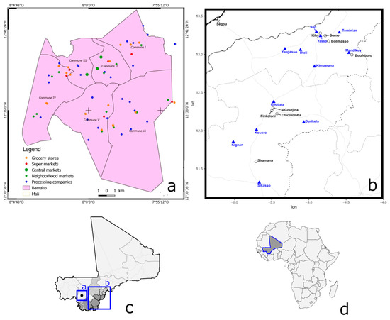 Location of study sites: (a) Map of surveyed markets and retailers in Bamako; (b) map of surveyed markets (blue triangles) and villages (open circles) in the Sikasso and Ségou regions; (c) location of study areas within Mali; (d) location of Mali within the continent of Africa.