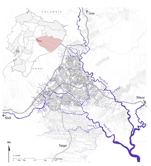 Puyo (1.4837° S 78.0026° O) lies on the west side of Pastaza Province, the eastern region of Ecuador [34]. It is one of the most important settlements in the Ecuadorian Amazon Region and the main Amazonian center because of its strategic localization, linking the Amazonian and Andean regions. Puyo is situated in the microbasin of the Puyo River (north) and Pindo River (south) (Figure 1), meaning that several creaks and flooding areas cross the city. In fact, the most important latent risk in the urban area is flooding (Vallejo-Tamayo, 2019).