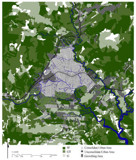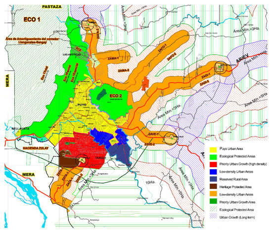 In the case of Puyo, the growth of settlements is exceeding the administrative political limits of the city of Puyo. This is the case with Tarqui (in the south) that belongs to another parish of the same canton and Shell (in the west) that belongs to another canton [35]. Thus, the aforementioned growth rate refers only to the consolidated area of Puyo; if Puyo and its unconsolidated surrounding settlement were considered together, the growth rate would be even higher. Therefore, there is much demographic pressure. In this paper, Puyo and its surrounding unconsolidated settlement are considered as one human settlement system. From now on, we designate this human settlement system as Puyo. Land uses of Puyo’s influence areas are displayed in Figure 2 according with the Territorial Urban Planning of Pastaza Caton [34,36].