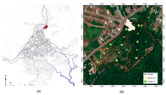 The Puyo Tourist Walk is located in the peri-urban areas of Puyo (Figure 3a) and was selected for this work as a case study of the ecosystem services of the city’s urban periphery. It is very close to an area of city with high demographic pressure, and it is also on the edge of a protected area beside the town [29]. The studied plots are 6.4 Ha, delimited by Rio Puyo and 20th century railway tracks (Figure 3b), located in Zone 18S, with a latitude of −1.48 a longitude of 78.00 and an altitude of 930–950 mas. According to the municipality data, the average annual temperature is 21.35 °C and the average rainfall is 1000–4000 mm, evenly distributed throughout the year. Relative humidity is high, at around 87.83% [10].