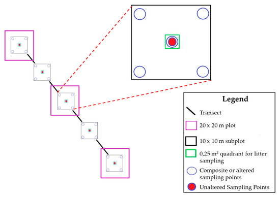 The method of sample collection to measure carbon sequestration and biodiversity indices was developed just in the study area. In each land unit (G, GT and SF), systematic soil sampling was carried out to establish a transect that covered the entire selected study area (Figure 3a). In each transect, five soil sampling points were established in an equidistant manner, where a subplot of 10 × 10 m was located (Figure 4, black square). The sampling points are numbered successively, from 1 to 5 in SF, from 6 to 10 in GT and from 11 to 15 in G). The georeferencing of the 15 points can be found in Appendix A (Table A1).