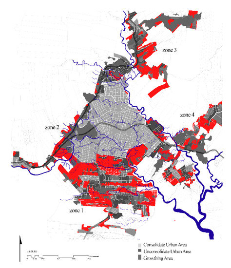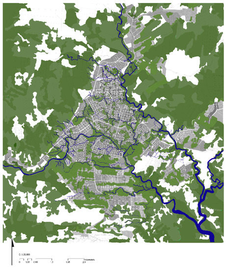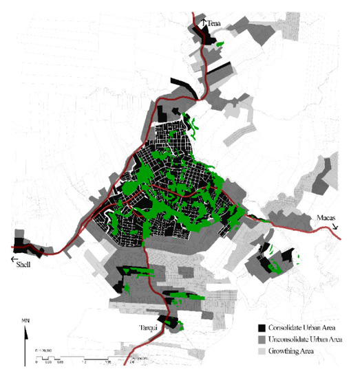 Figure 5 displays the consolidated urban area (marked as black) and the unconsolidated urban area (marked as dark grey), as well as the new expansion areas (marked as light grey), according to the last Urban Plan [34]. As can be seen, the total urban expansion area of Puyo represents 62% of the total area, due to the developing low-density growth pattern (Detail 2 in Figure 5). The unconsolidated area represents 38%, while the new urban expansion area is 24%. In the case of the consolidated area, 30% is green area and 80% is linked to flood areas (rivers or canals) (Figure 6).