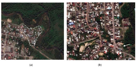 About 80% of the peri-urban areas with the greatest environmental value (SF and GT) are linked to flood areas, where building should be not allowed [35,66]. For this reason, the green areas that we propose to conserve reduce the hydrological risk of the settlement as another ecosystem service. However, according to the data obtained in the investigation, this limitation is not always met. Thus, we can see areas of the city that are flooding areas in which there are buildings (Figure 11); this is the case of the La Isla neighborhood (Figure 11a), which, as the river flow increases, causes problems of habitability for the population [67]. These areas should be restored, keeping them as green spaces that are also public spaces [68]. To protect and restore water-related ecosystems, such as those in Puyo, as wetlands or rivers, is one of the targets in the SDG 6: “Ensure availability and sustainable management of water and sanitation for all” [31]. In the case of the consolidated area, 30% is currently occupied by green areas linked to these flood zones (Figure 6). These have undervalued potential in urban planning, being considered in most cases as wastelands rather than as structuring axes of the city. Previous studies confirm that the development of these green spaces as structuring axes of the city improves the quality of the urban environment by promoting the conservation of biodiversity [69]. Urban planning of Puyo should maintain the connectivity of these green areas and their heterogeneity as structural axes in order to prevent habitat fragmentation [70].