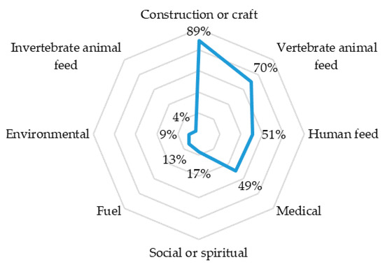 On the other hand, when analyzing the distribution of the individuals in the diametric classes, it was observed that there was no uniform representation, which is characteristic of young tropical forests in the process of recovery [54]. In particular, it was observed that 75.97% of the individuals identified correspond to the lower diametric class (10–20 cm), contributing to 28% of the total volume, while 8.53% of individuals in the upper diametric class (>30.1 cm) contribute to 53% of the total volume. That is, most individuals are in the lower diametric class, and the number of individuals increases as the diametric range increases, as observed by other authors [11,58], in the Peruvian Amazon. The sampling carried out includes three individuals of the highest diametric class belonging respectively to the species Nectandra membranacea (DBH = 72.26 cm), Inga stipitata (DBH = 59.21 cm), and Pouteria torta (DBH = 57.30 cm). However, most of the elements identified in the sampling were diametric class (10–20 cm) trees belonging to the families Asteraceae, Moraceae and Melastomataceae. The majority presence of these species within this diametric class has been considered to be closely related to the wood characteristics of these species [59], which justifies the presence of many small trees in places close to human populations.