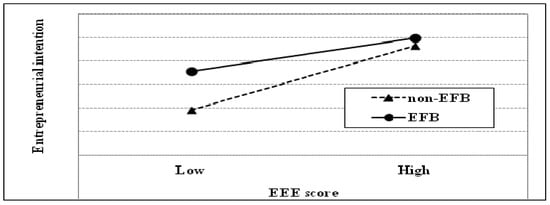 We continued adding the interaction effect between EFB and EEE to verify hypothesis H4. (Model 6). This model did not improve significantly in comparison with the direct effect model (Model 3) according to its R2 of 5.9% (Model 6: R2 change = 0.001, p = 0.438), indicating that the interaction variable explained only a very small percentage of EI variation. The moderator variables EFB (β = 0.151, p < 0.01) and EEE (β = 0.164, p < 0.01) were significantly positively associated with the EI, as can be seen in Table 4 (Model 6). Also, we found an insignificant negative interaction effect between EFB and EEE (β = −0.031, p = 0.438, Model 6). Taking these results into account, in order to better identify the interaction effect between EFB and EEE on EI, the impact of the EFB moderator on the EEE–EI relationship was retested by adding the interaction term between EEE and EFB in the model without the control variables (Model 7). Model 7 was statistically significant (F (3613) = 10.144, p < 0.001) and accounted for over 4% of the variance of EI (R2 = 0.047, Adjusted R2=0.043). EEE received the strongest weight in the model (β = 0.162, p < 0.01), followed by EFB (β = 0.158, p < 0.01), which suggests that EEE influences EI positively and its influence is stronger than the EFB of students. In this model, the interaction effect between EFB and EEE was significantly negative, but marginal (β = −0.041, p < 0.10, Model 7). Moreover, based on the unstandardized coefficients of the regression model (Model 7), according to Preacher et al. [], the moderating effect of EFB on the EEE–EI relationship is plotted in Figure 2. EI is on the y-axis of the dependent variable and EEE is plotted on the x-axis of the independent variable, representing low EEE (one standard deviation below mean) vs. high EEE (one standard deviation above mean).