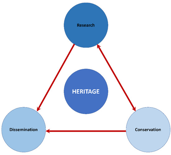 It is commonly accepted that heritage management rests on three fundamental pillars: research, conservation and dissemination (or education) [13]. The inter-relational flows of these three key aspects of heritage are illustrated in Figure 1. Until about 30 years ago, researchers, restoration experts and visitors could only work and/or feel the experience of heritage by the means of direct sensorial contact with the physical artefacts/structures. Nevertheless, virtual reality (VR) provides new ways to research [14], restore [15] and disseminate [13] different kinds of heritage. In particular, VR has had a profound impact on dissemination. Today, visits to emblematic archaeological sites are very common and some of these now offer a double experience to users of VR: firstly, regarding the visit itself, which takes place using a product of real virtuality (RV) (e.g., the Lascaux IV neo-cave) and secondly, enhancing the experience with virtual reality (VR) tools (https://www.lascaux.fr/en). This combination, far from being redundant, becomes very attractive for visitors because both experiences are complementary [16]. In addition, the second application invites visitors to make their own decisions [17]. This may be related with a question pointed out by D. Haraway several decades ago: “Another critical aspect of the social relations of the new technologies is the reformulation of expectations, culture, work (…)” [18] (p. 518). Also, our progressive approach to a cyborg-type conditioning of (hybrids between humans and machines) [18] implies that the use of these kinds of tools now lends, a fortiori, a more attractive experience to the public experiencing cultural heritage. Nevertheless, both VR and RV have to deal with objectives leading to resolve heritage questions that include, as we have said before, research, conservation and dissemination of scientific results. VR and RV are not, therefore, ends in themselves, but rather they are tools that contribute to a better understanding of the past [19].