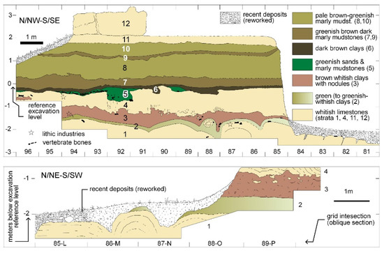 Two distinct archaeostratigraphic units compose the site’s depositional sequence: the Lower Unit (levels 1–4) and the Upper Unit (levels 5 to 12) [34] (Figure 3). Most of the archaeo-paleontological evidence comes from levels 3 and 5. In addition, the FN3 site has provided an age of 1.19 ± 0.21 Ma by the method of 230Th/234U [33], in agreement with the paleomagnetic analysis and the biostratigraphic evaluations [34,35,36]. From a lithological point of view, the predominant sedimentary materials are clays, mudstones and limestones (Figure 3) [34]. A geological fault revealed during ongoing excavations extends in an east-westerly direction along the site.