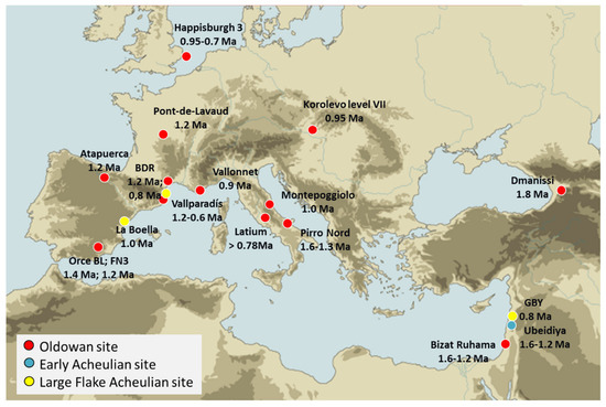 Geographical situation and published ages of selected Oldowan, Early Acheulian and Large Flake Acheulian sites from Western Eurasia during the late Early Pleistocene (modified after [42]).