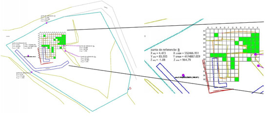 The FN3 site is geo-referenced in the Spanish official reference coordinate system ETRS89 UTM Zone 30, also expressed in a local coordinate system (LCS) where the origin (X = 0, Y = 0, Z = 0) is very close to the excavation area (Figure 5). The LCS divides the excavation area into square-meters, where the X axis is denoted by letters and the Y axis by numbers (each in ascending order per 1 m squares). The present extension of the FN3 archaeological site is of 13 × 13 m (Figure 5).