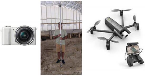 The photogrammetry was carried out using two different approaches for the campaigns 2017 and 2019. In 2017, we used a Sony Alpha 5000 camera suspended on a pole, in order to achieve a vertical image. From a heritage conservation point of view, this procedure was inconvenient because it required a person to tread on the excavation surface, thus risking to inadvertently damage some of the remains. For this reason, in 2019, we decided to perform the photography using a remotely piloted aerial system (RPAS) (Parrot Anafi). This micro aerial vehicle was small enough so that its air flow does not affect the surface of the excavation. The above-mentioned set of camera, pole and RPAS are shown in Figure 6.