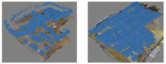 The image acquisition was not performed in automatic mode for either of the 2017 and 2019 field seasons was the imaging acquisition performed in automatic mode. The images taken in 2019 were produced with the RPAS, which allows a more homogeneous picture distribution because it uses a human pilot that tries to capture them at equal distances. Contrastingly, in 2017, image acquisition was carried out with a camera assembled onto a pole. Such a procedure was constrained, however, because those parts of the site with exposed fossils could not be stepped on. To solve this constraint, some pictures were taken in an oblique position, so that the image set was not distributed in a homogeneous way (Figure 8).