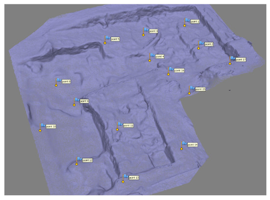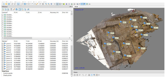 The relative orientation of the photographs shown in Figure 8 was obtained using the photogrammetric alignment process: the absolute orientation (levelling and scaling as referred to the LCS) was achieved by assigning 3D coordinates to some targets (survey control points) all over the excavation area. The survey control points have been referenced using a Total Station Leica TS03, equipped with an angular accuracy of 3” and 1.5 mm ± 2 ppm in range. The mean error after fitting the images bundle in 2017 was 4.7 mm, as shown in Figure 9. The software used in the photogrammetric process was Photoscan version 1.5.2 from the Agisoft company.