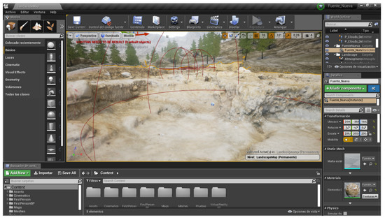 Because the 3D model to be included in the Unreal Engine should be as light as possible, we simplified the triangulated model from a lower dense cloud. Table 3 shows the dense cloud and the number of triangulated faces for the high and simplified model.