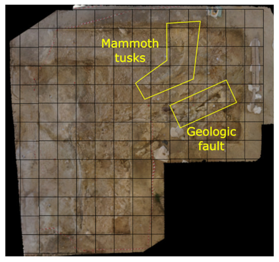 Horizontal ortho-image from Fuente Nueva 3 indicating the mammoth tusks and the geologic fault.