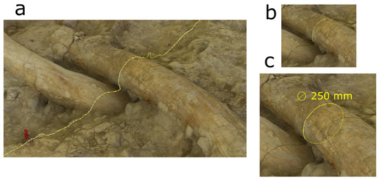 It is possible to obtain more accurate measurements from the mammoth tusks, such as their heterogeneous diameter from the base towards the tip. Because part of the tusk has not yet been excavated (only part of the tusk is exposed on the surface), we were able to estimate its diameter using least square fitting [44]. To obtain the diameter in a particular area of the tusk, we made a section (intersection between a plane and the tusk), approximately perpendicular to the tusk axis. The resulting section is shown by the yellow polyline in Figure 15, a. In order to get an approximated suitable circle adapted to the tusk sectioned, we segmented the polyline, keeping only the segments on the tusk surface (Figure 15b). The circle fitted by a least squares approach can be observed in Figure 15c, where the polyline segment of Figure 15b is also superimposed. With this method, the value obtained for the diameter was 250 mm.