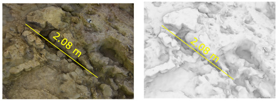 The 3D textured model, supported by a solid representation, proved to be an ideal asset for obtaining more precise 3D measurements and also to identify some structural properties that, in a single ortho-image, are not detectable. The solid representation is a mesh, shaded using a single color and showing directional shadows. Figure 14 shows two mammoth tusks, one of which has been estimated to measure about 4 m long, although the visible part on the excavation surface displays only 3.51 m. It is possible to appreciate the quality of the 3D model, not only in the textured form, but also in the solid representation. In our case, the solid representation was particularly useful in identifying an area where the largest tusk was broken (Figure 14).