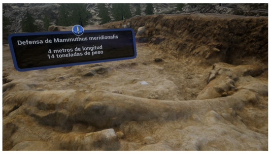 Still another advantage is that the public can ‘walk among mammoths’ without incurring any damage to this unique archaeo-paleontological heritage. People can approach and observe a re-creation of the archaeological remains in an even higher level of detail than if they were observing the site from the visitor’s balcony or surrounding walkway it and thus experience a sensation similar to that of the archaeologists themselves. In addition, the VR engine (in our case: Unreal Engine) facilitates the display and understanding of important data in order to guide the VR tour over the excavation. In this case, the audience can see an informative signboard indicating highlighted information (Figure 17).