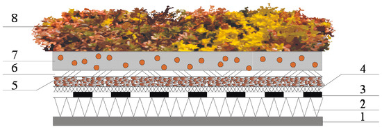 The construction details of green roof extensive models: substrate with expanded clay aggregate and substrate with perlite. 1—model support construction; 2—thermal insulation, extruded polystyrene (XPS); 3—insulation water proofing membrane; 4—geotextile, type RMS 300; 5—gravel layer with granulation from 1 to 2 cm; 6—filtration geotextile; 7—substrate of light expanded clay aggregate or perlite (depth substrate together with filtration geotextile and gravel layer, 80mm); 8—plants of the sedum species (Sedum spurium, Sedum sexangulare, Sedum telephium, Sedum floriferum, and Sedum album).